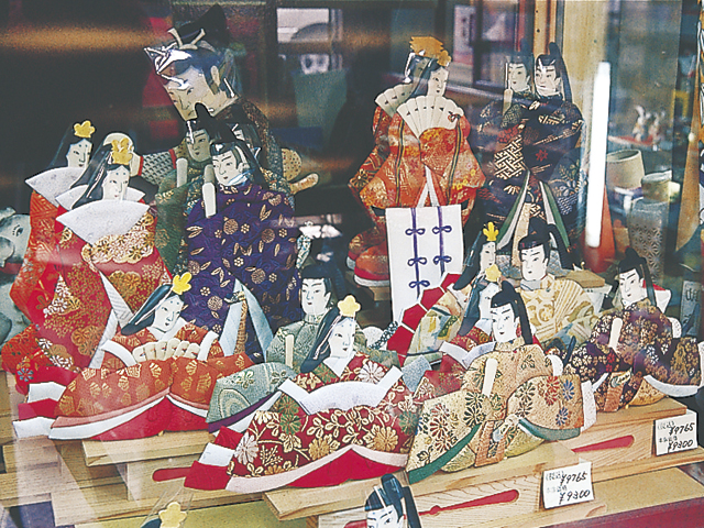 「ベラミ」とは、フランス語で美しき友という意味。もとは日本人形を扱う店だったが、昭和初期に途絶えた松本押絵雛の修理をきっかけに復元の研究を始め、現在では松本押絵雛や七夕人形を製作している。店内には復元のために収集した昔の押絵雛もあわせて展示。おみやげ用には伝統の七夕人形670円~、松本押絵雛は6215円~、松本姉様人形2420円~などを。店の奥が工房。地元では押絵の教室も開いている。