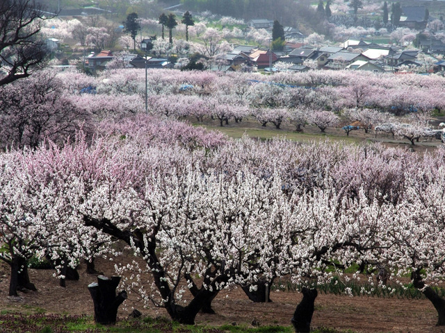 屋代駅の東側、森・倉科[くらしな]地区は、一目十万本とも言われるあんずの里。開花期の3月下旬~4月上旬には「あんずまつり」が開催され、多くの花見客が訪れる。また、6月中旬から7月上旬にかけて、あんずの実の時期をむかえ、貴重な生あんずを購入できる。