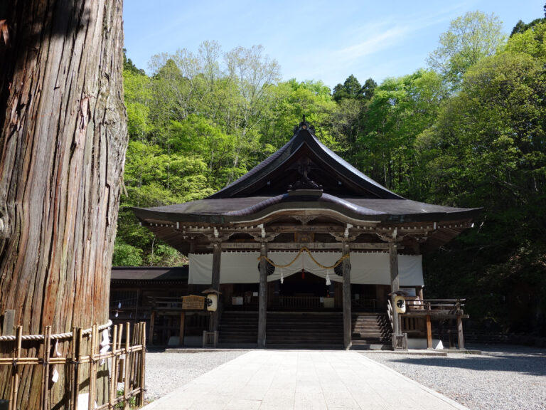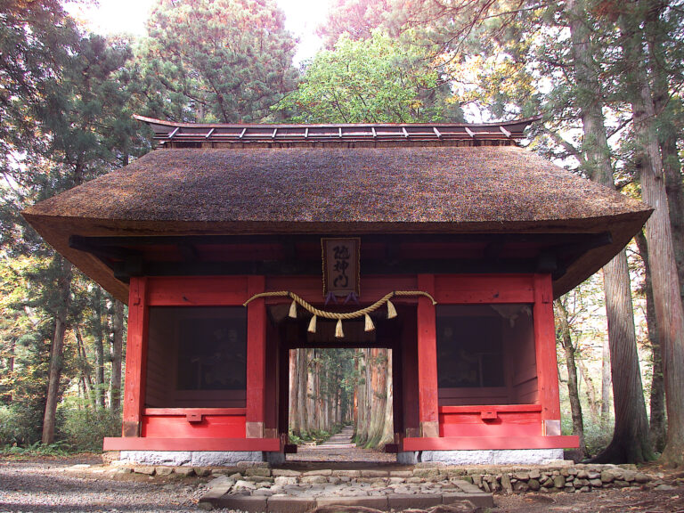バス停戸隠奥社入口からすぐの鳥居と奥社を結ぶ参道の中ほどにある。茅葺き屋根が時代を感じさせる朱塗りの門で、左右の随身像が参拝者を迎える。車乗り入れ不可。ここからは樹齢400年を超える杉並木が400mほども続く静寂の世界だ。