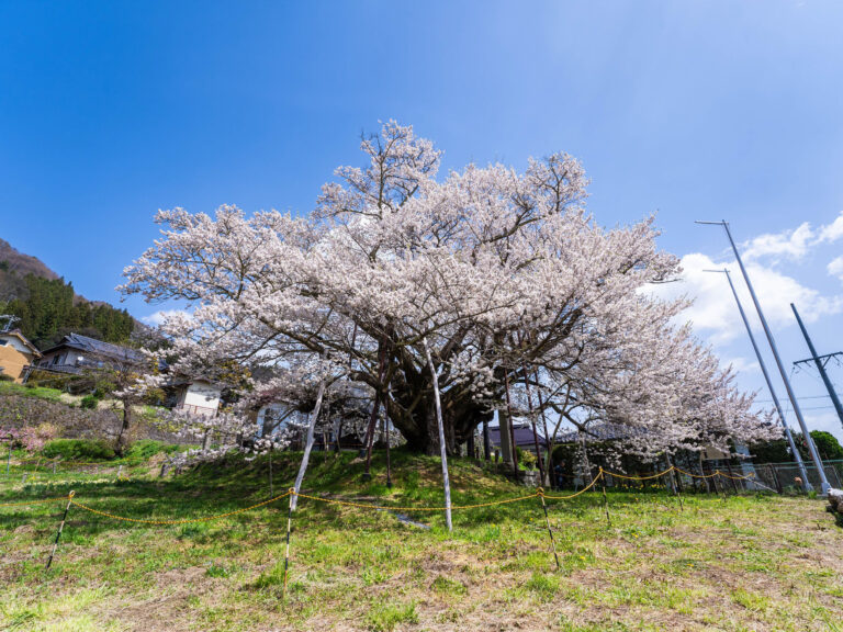推定樹齢約1200年のエドヒガンザクラで、根回り約9mの巨木。国天然記念物。