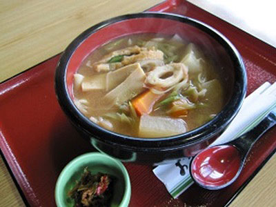 長野市と白馬村を結ぶオリンピック道路沿いにある道の駅。食堂では、幅広に打った麺とニンジンやネギ、大根などたっぷりの野菜を、味噌味で煮込んだ郷土料理「おぶっこ」690円など、伝統の味が楽しめる。おやつには名物笹おやきや、リンゴの優しい甘みが詰まった中条産りんごソフト330円がおすすめ。
