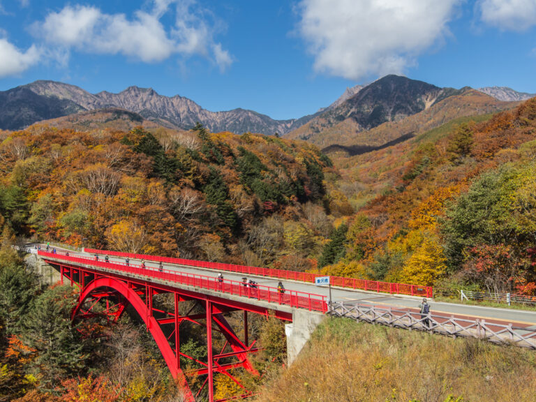 八ヶ岳の地獄谷(権現岳東側)から流れ出る川俣川の東沢渓谷に架かる長さ約90m、高さ約49mのアーチ橋。ドライブコースとして人気の八ヶ岳高原ラインの途中にあり、橋桁や欄干が赤いことから通称は「赤い橋」。雄大な八ヶ岳を背景にした景観が素晴らしく新緑や紅葉は格別。特に10月下旬から11月上旬には、聳え立つ八ヶ岳の主峰赤岳に、ナナカマドやカエデ、カラマツなどの赤や黄色に染まる紅葉と赤い橋が美しく映えて、橋の東側たもとのレストハウス駐車場からの眺めはため息が出るほど。
