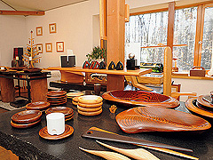 木工の工房兼ショップ。光が差し込む明るい空間には、無垢材を用いた個性的な木工品が並ぶ。ペンスタンド、フォトスタンド各1800円。茶托うるし塗り3000円など。