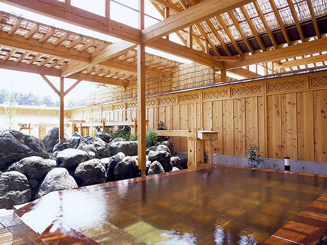 「ロイヤルホテル河口湖」の浴場「開運の湯」を一般客にも開放している。男女別に石造りの大浴場と、露天風呂が2つある。木の香がかぐわしい板塀が和風情緒満点の造り。露天風呂の1つは屋根付きの赤御影石造り、もう1つは銘石を配した岩風呂で、趣が異なる2つの露天風呂でのんびりと入浴が楽しめる。館内には無料休憩所はなく、ロビーが利用できる程度だが、有料の個室を完備しているので、入浴後にくつろぐこともできる(要予約)。