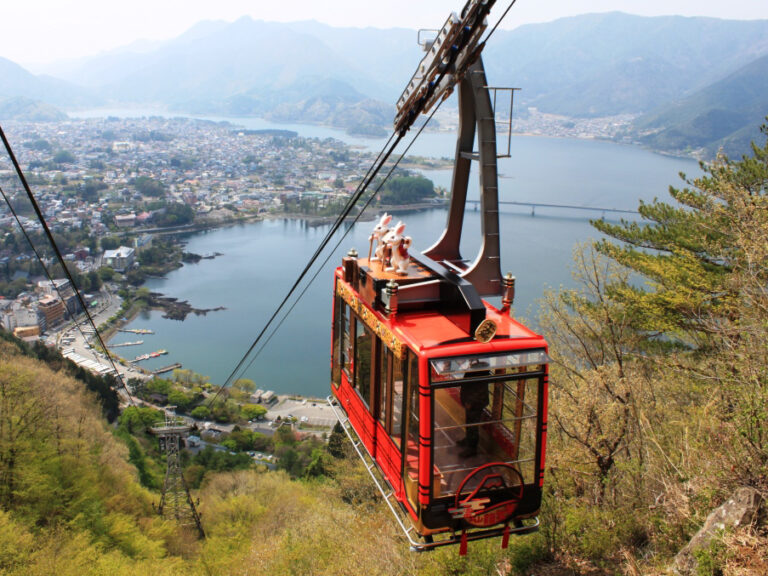 天上山は、太宰治が昔話『かちかち山』をモチーフに書いた『お伽草子』の中の一遍『カチカチ山』の舞台となった山。標高856mの河口湖畔駅から1075mの富士見台駅まで、ロープウェイで登ること約3分。目の前には、日本一の富士山と河口湖の大パノラマが広がる。展望台に富士山と向かい合って立つハート形の「天上の鐘」は、絶好のフォトスポット。展望台のたぬき茶屋では、富士山を眺めながら名物のたぬき団子や暑い季節にぴったりの冷たいアイス・ジュースが味わえる。