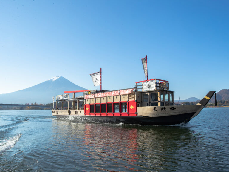 遊覧船天晴一周20分の湖上散歩へ。河口湖は変化に富んだ湖岸の景色が楽しめ、晴れた日は逆さ富士が見られるかも。客室は和をイメージしたゆったりとした空間で、晴れた日には2階席がおすすめ。ケージに入れればペット同伴もOK。武田信玄の水軍の安宅船をモチーフにした遊覧船で出航。