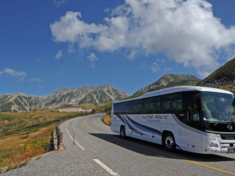 美女平~室堂間の約23km、所要50分、標高差約1500mを走るバスは、ほとんどが環境にやさしいハイブリッドやクリーンディーゼルバス。美女平近くの巨大なタテヤマスギ、仙洞杉は必見。美女平~弥陀ケ原間は、急カーブが連続する道路の両側に杉の大木が続き、滝見台と呼ばれるカーブからは、対岸に落差日本一の称名滝[しょうみょうだき]が流れ落ちる様子を眺められる。天狗平~室堂間は視界が開けているため、山々の連なりの向こう側に麓の富山平野が見える。天狗平や弥陀ケ原などではハイカーの姿も。室堂手前の天狗平、弥陀ケ原、弘法(季節開設)で途中下車する場合は、降車時に、次に乗車するバス便を予約する必要がある。