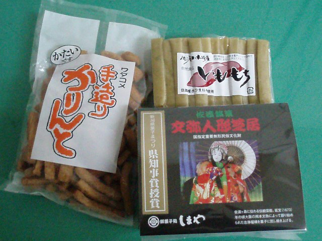 両津港佐渡汽船ターミナル改札口脇にある、地元の名産品が揃う売店。佐渡産もち米を使用したかけもち700円や、定番人気の手造りかりんと380円はあとを引くおいしさだ。自然な甘みが魅力の桃・ブルーベリー・いちじくジャム720円~やいももち580円も出航前にぜひ。