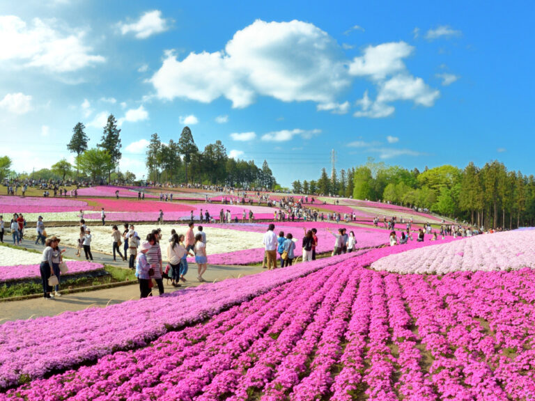 西武秩父駅東側の高台にある緑地公園。秩父の市街地や武甲山が見渡せ、春には約1000本の桜が咲いて花見客で賑わう。また、4月中旬~5月初旬には約1万7600平方mの広さに咲く10品種40万株以上のシバザクラも圧巻。「芝桜の丘」西側には、羊が飼育されている「ふれあい牧場」があり、家族連れに人気だ。