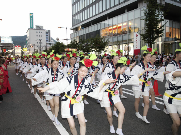 創設時より受け継がれた「市民総和楽、総参加」を基本理念とした伝統ある長野の夏祭り。善光寺本堂において1400年余り燃え続けている「不滅の常灯明[ふめつのじょうとうみょう]」よりご法灯を頂戴した火釜を設け、解放された中心街路上で「びんずる踊り」を踊る。 画像提供:長野びんずる実行委員会