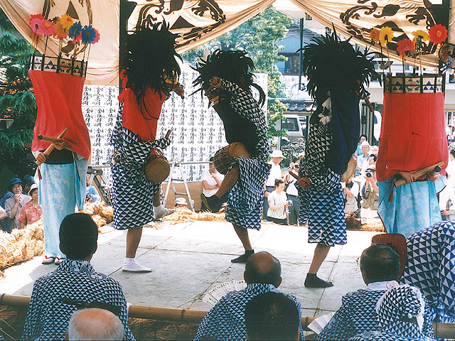 旱魃で水が不足し、雨降りの祈祷をしたところ雨が降り、五穀豊穣となるが、2年後雨が降りすぎて、今度は雨止めを祈祷をした。その願いが叶い、住民が本堂に対し感謝をするための舞を奉納したのが始まり。13~15時。