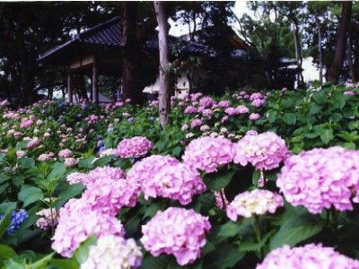 三河湾岸に湧く景勝のいで湯、蒲郡[がまごおり]温泉郷の一つが形原[かたはら]温泉。その形原温泉にある補陀ケ池周辺があじさいの里として整備され、遊歩道沿いに5万株のアジサイが咲く。期間中は21時までライトアップされ、青、ピンク、白など20種類を超える色とりどりの花が幻想的な姿を見せてくれる。夜間にはゲンジボタルの神秘的な舞いを見ることもできる。