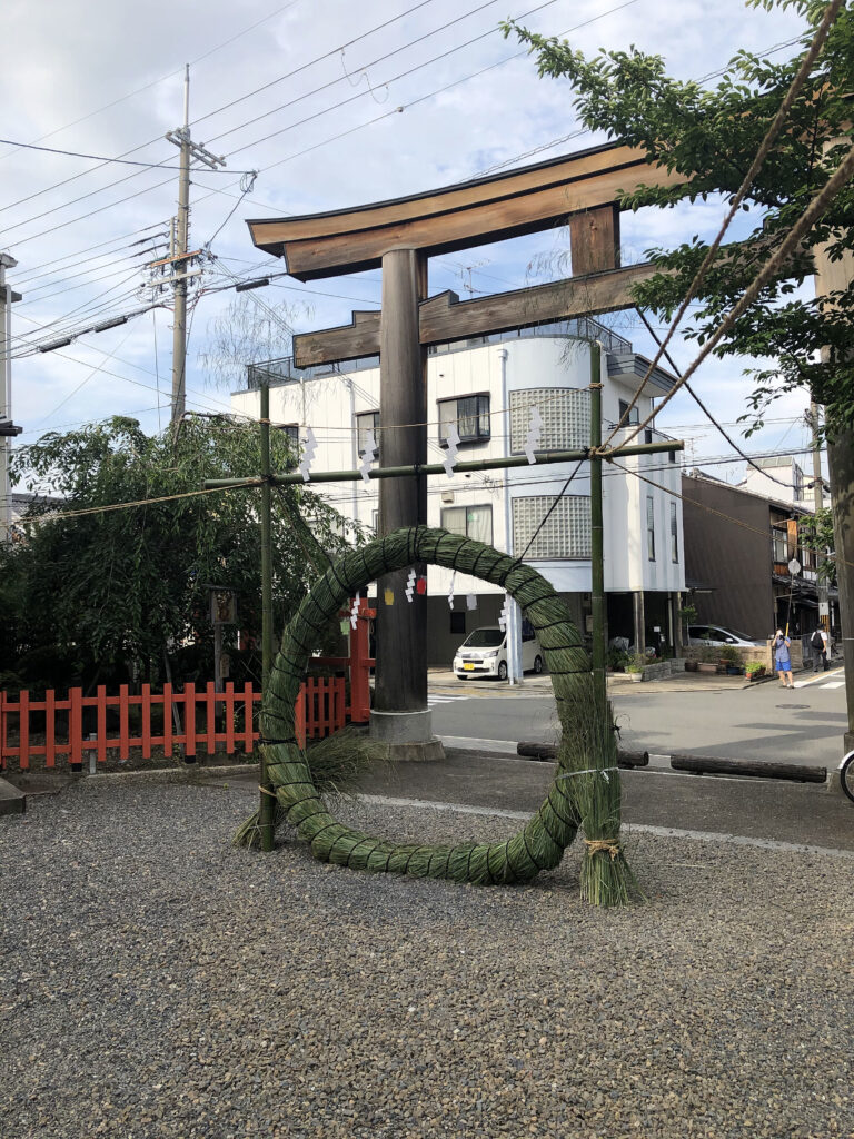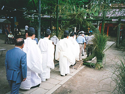茅[かや]で作った直径2m余の大きな輪をくぐって無病息災を祈る古来からの神事。茅の輪くぐりの和歌(その場で配布される)を皆で唱和しながら、左まわり、右まわり、左まわりと皆で一緒に3回くぐる。※状況により内容変更の場合あり。