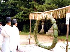 半年毎に知らず知らずの内に犯した罪や穢れを人形に託し祓い清める伝統神事。夏越大祓式には本殿前に大きな茅の輪[ちのわ]を立て、この輪をくぐってこれから暑くなる夏に向かって元気で過ごせるように祈る。