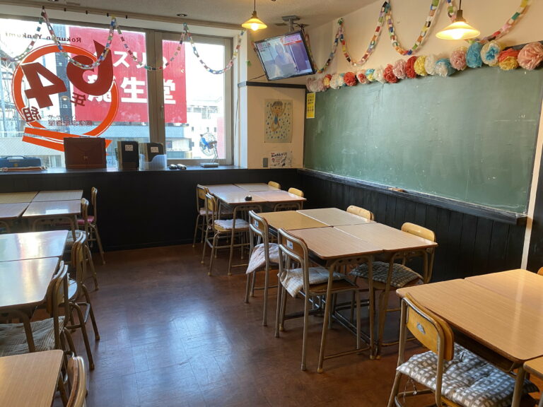 お客が児童になり、小学生時代にタイムスリップしたような雰囲気が味わえる、小学校をモチーフにしたユニークな居酒屋。入口には、黒板やランドセルや懐かしい紙の花飾りがあり、店内には、国旗が張られた廊下や校長室、保健室や図工室などの個室が並ぶ。お客が生徒でスタッフは先生という設定で、机や椅子は実際に小学校で使われていたもの。ドレッシングが注射器に入った「シーザーサラダ」、試験管や三角フラスコのドリンクメニュー「理科のお勉強」などメニューもユニーク。
