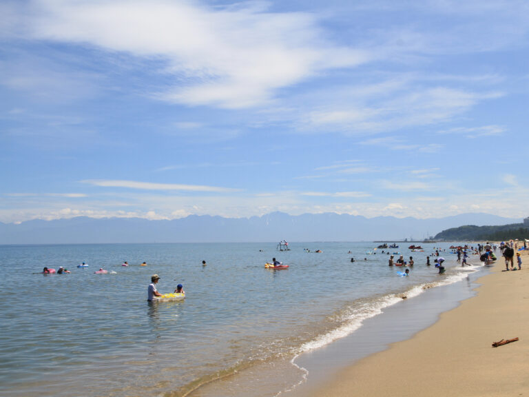 在位于白沙青松的岛尾海岸的县内首屈一指的海水浴场,每年都有很多人热闹非凡。除了希望隔海的立山连峰的美丽景观之外,在水质、安全性、清洁度、设备等方面也有基准以上的评价,被认定为环境省的 “快水浴场百选”。露营场也相邻。