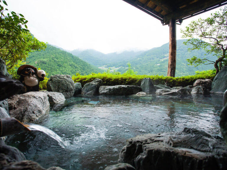 在祖谷的草桥附近被险峻的群山和深谷夹着的旅馆 “酒店草桥”,接受当日往返入浴。乘坐山间小屋风格可爱的缆车的露天温泉是名产,在开山的地方,排列着男性用、女性用、包租浴室这3个浴室。在浴池前,只有四国山地雄伟的山峦和散布在远处山体上的民宅。我想一边眺望着这绝美的景色,一边悠闲地享受温泉。只有住宿者才能使用包租浴室。