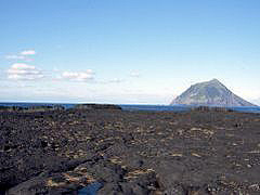 八丈富士喷发时流出的熔岩流入海中形成的熔岩台地。沿着大海,长500m、宽100m的黑色玄武岩展开,形成了荒凉的世界。经过漫长的岁月被侵蚀,撞击岩壁的波浪变成水花飞散的样子正是震撼力之一。附近有在关原之战中失败,被流放到此地的宇喜多秀家和给丈夫和孩子一生持续送米和药的正室 · 豪姬的像,朝着秀家旧领国冈山的方向关系很好地排列着。为了寻找漂浮在大海上的八丈小岛和美丽的夕阳,当地的摄影师也经常光顾。