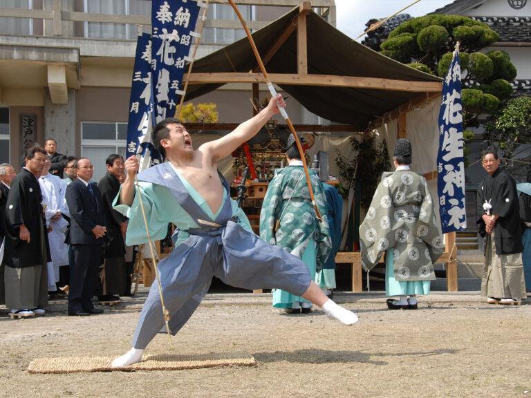 在驅魔的神事中,背負著氏子全體人員的厄運站立的役主拉著弓放出箭,有祈禱惡魔撤退的意思。 2名役主中的年長者稱為大前,另一方稱為小前,首先,大前一邊大聲喊著 「康的箭」,一邊以靶子為目標放出兩支箭。 ※ 根據情況有中止的情況。