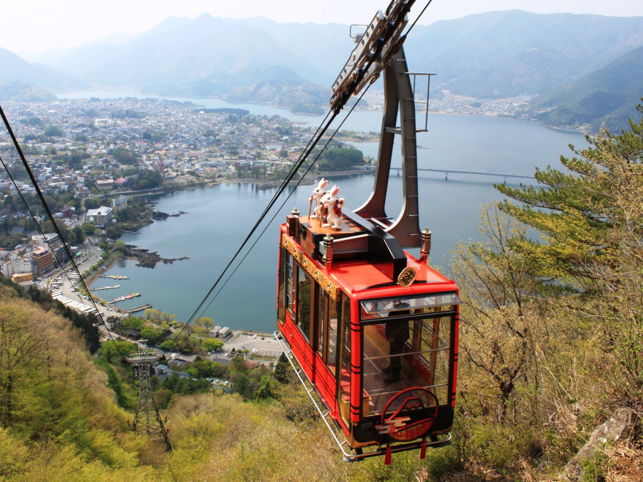 富士急行河口湖站 → 乘坐富士急河口湖周遊巴士15分鐘,巴士站: 遊覽船纜車入口下車,步行即到