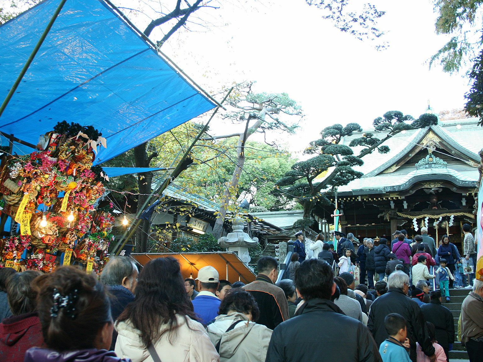 足立區的大鷲神社是作為武運長久 · 開運守護之神而被信仰的古社。 以 「花圃とりさま」 的名字也很受歡迎,是酉市發祥的公司。 酉市起源於古代在應永年間 (1394 ~ 1428) 舉行的對日本武尊的感謝祭,之後,據說在門前開市了。 在廣闊的院內排列著賣吉祥物耙子的小攤,進行著威風凜凜的束手無策,很多人都很熱鬧。 耙子上附有紙幣和稻穗的 「帥氣」 也被稱為 「抓住運氣的耙子」 或 「抓住幸運的鷹的腳」,在標籤所被授予。