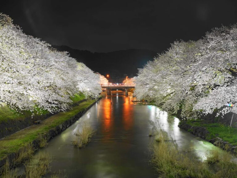 可以一覽盛開的染井吉野大樹。 規模如此之大的櫻花樹密集開花的情景在國內也很少見。 夜晚點亮所有的櫻花。 因為過於優美而屏住呼吸,肯定是讓人不由得想拍到照片的亮點。 也有廚房車的當地美食的款待。 山口縣美市盛開的櫻花迎接到場者。
