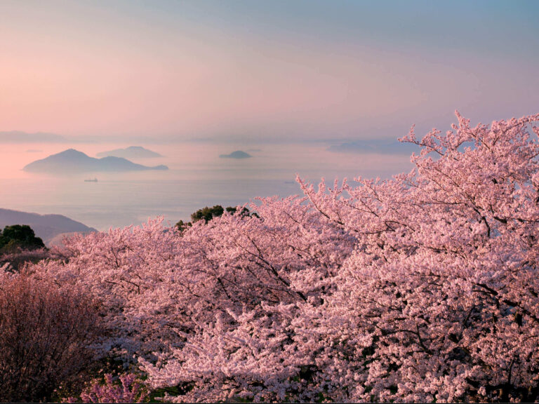 位於在瀨戶內海細長突出的莊內半島中央的海拔352m的山。 傳說浦島太郎黎明後的玉手箱的煙霧變成了紫色的雲,留下了山。 天氣好的時候,比起展望台,南邊是四國山地,北邊是瀨戶的多島美,可以欣賞到櫻花和紫陽花等四季應時的花。 在山頂附近的咖啡店,可以一覽瀨戶內海。