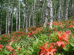 6月中旬左右是觀賞時期。 在白樺樹林中盛開的朱紅色的杜鵑花,與白樺樹的白色、新綠的鮮艷的綠色形成了絕妙的對比。 另外,可以一邊感受涼爽的風和鳥鳴,一邊體驗森林治療,作為攝影景點也很受歡迎。