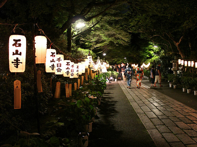 千日會萬燈的燈籠懸掛在從東大門到正殿的參道兩側,院內全天免費開放。 8點開門,21點關門 (最終入山是20點30分)。 據說這天參拜石山觀音有一千天的功德,很多人都很熱鬧。 圖片提供:石山寺